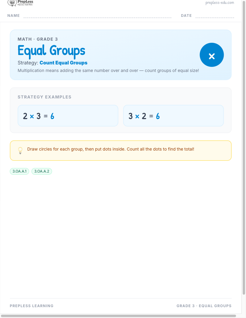 Understand multiplication through equal groups, arrays, and number lines — the foundation of Grade 3 math.